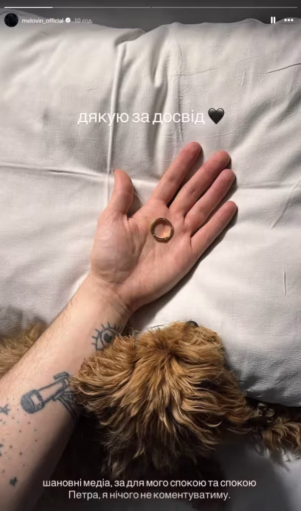 «Ми розійшлися. Це рішення далося нам обом дуже важко, але ми вирішили йти далі окремими шляхами. Дякую тобі, Петре, за все, що було. Дякую вам усім за любов і підтримку. Бережіть себе. Меловін».